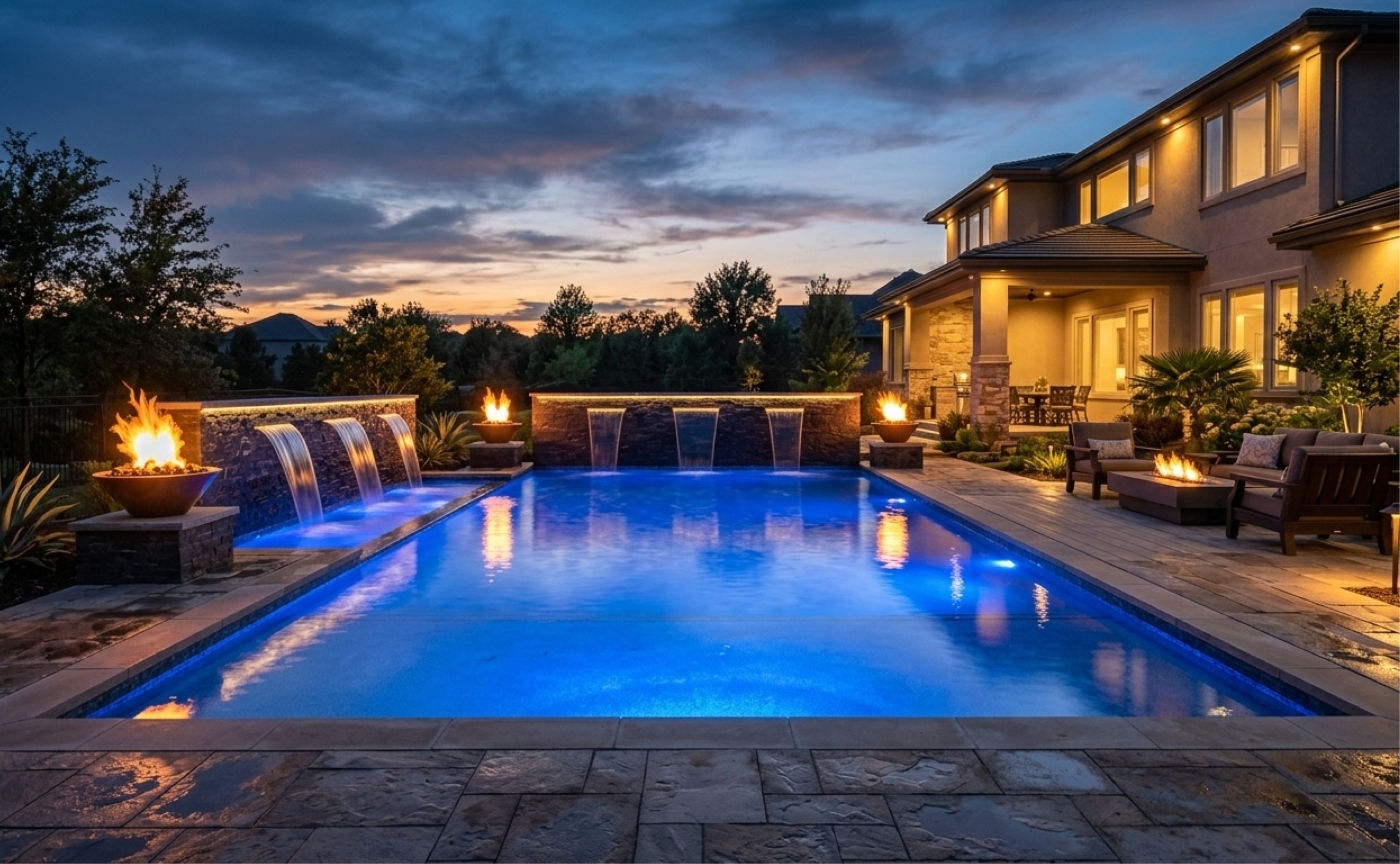 Add waterfalls, fountains, tanning ledges, fire bowls, and LED lighting.